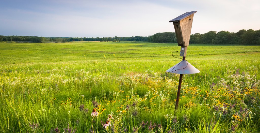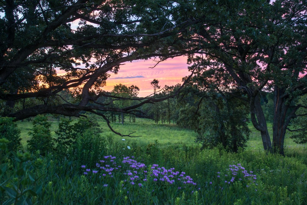 The prairie is surrounded by 175 acres of woodlands with ancient oaks and hickories. Visitors experience open skies, expansive views, and a strong sense of prairie scale that contrasts beautifully with nearby woodlands. Restoration work here includes invasive species removal, prescribed burning, seed collection and planting, and ongoing habitat management to increase biodiversity. The result is a thriving grassland and woodland ecosystem that supports pollinators, birds, mammals, and a wide diversity of native plant life.